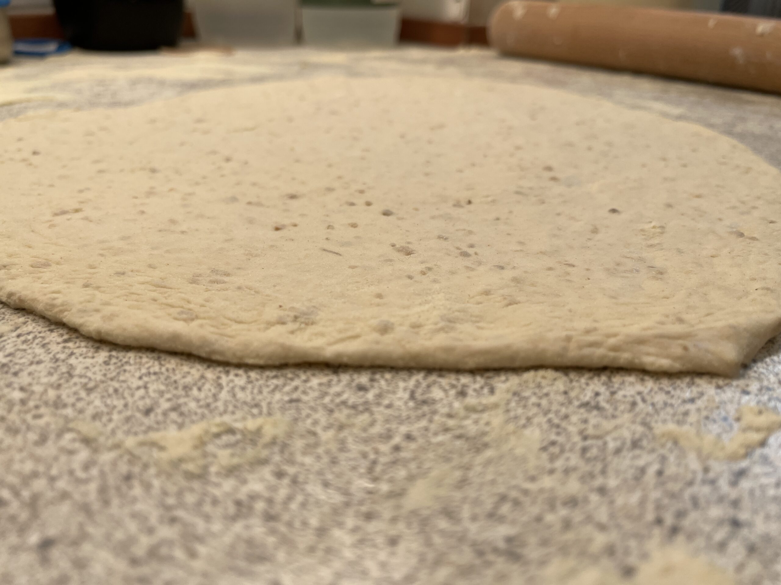 Rul dejkuglerne ud til meget tynde pizzaagtige cirkler – lad tykkelsen være 2-5 mm.