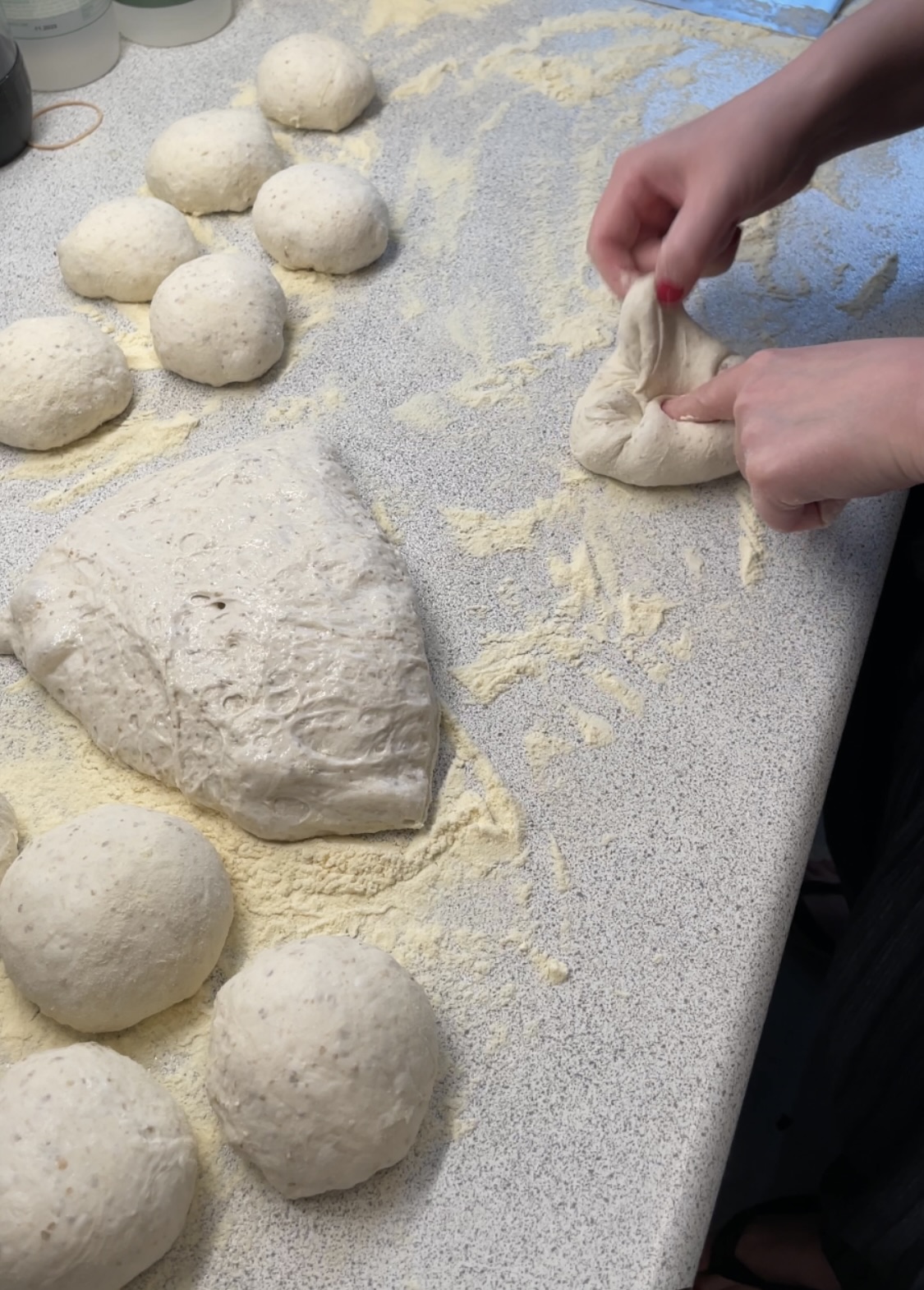 Efter den halve time kommer du salt, olivenolie og et lille stænk vand i din dej. Ælt det hele godt sammen og lad igen dejen hvile under låg – denne gang ca. 40 minutter. Sæt evt. en streg på siden af plastikbøtten med en tusch inden, så du kan holde øje med, hvor meget dejen hæver over de næste timer.